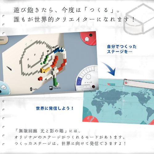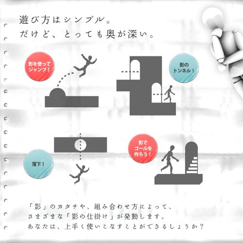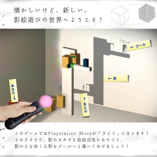 - モーションコントローラを懐中電灯に見立て、主人公(キャスト)をゴールへと導くアクションパズル。ステージはブロックで作られた箱庭世界となっており、ブロックを照らすと、その姿が箱の壁に映し出される。影のカタチをあやつり、道をつくり、キャストをゴールへと導くのが基本ルールとなる。全部で100種類のステージを収録しており、ステージによって映し出される影のカタチや仕掛けが異なる。また、クリエイトモードでは、自分だけのオリジナルステージを作成し、オンラインで共有することができる。