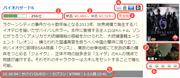 1 当サイトの分析とネット上の評価を平均化したもの(順位は現在の人気度) 2 価格が一番安いバージョンの新品・中古 3 完全版または関連ソフト 4 左から殿堂入り、体験版あり、オンラインプレイ対応、対象年齢 5 左から発売日、ジャンル、メーカー、定価、プレイ人数(通信プレイ) 6 ゲーム画像 7 最新動画を含め、わかりやすいものを厳選